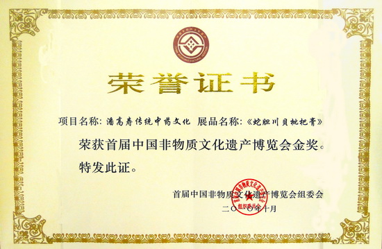 潘高壽傳統中藥文化,作為國家級非物質文化遺產項目,代表廣東參加了首屆中國非物質文化遺產博覽會。本屆博覽會是我國首次舉辦的非物質文化遺產綜合性展會,是全國非遺領域的一件盛事,是一屆圓滿成功、主題鮮明、內容精彩、探索創新的博覽會。博覽會的“展品獎”分金獎、銀獎和銅獎。潘高壽“蛇膽川貝枇杷膏”、北京雕漆技藝“剔紅聽濤圖”中堂掛屏等37件作品榮獲金獎,山東魯繡發絲繡“鵲華秋色”、新疆維吾爾族樂器制作技藝“卡龍”等84件作品榮獲銀獎,西藏藏香制作技藝“直貢藏香”等69件作品榮獲銅獎。